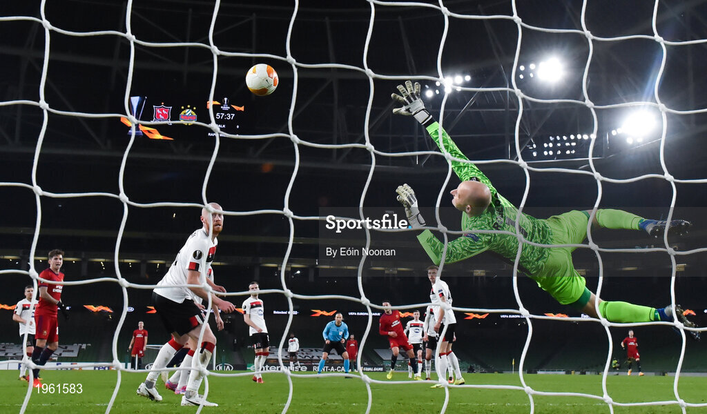 26 November 2020; Ercan Kara of SK Rapid Wien scores his side's third goal despite the efforts of Gary Rogers of Dundalk during the UEFA Europa League Group B match between Dundalk and SK Rapid Wien at Aviva Stadium in Dublin. Photo by Eóin Noonan/Sportsfile