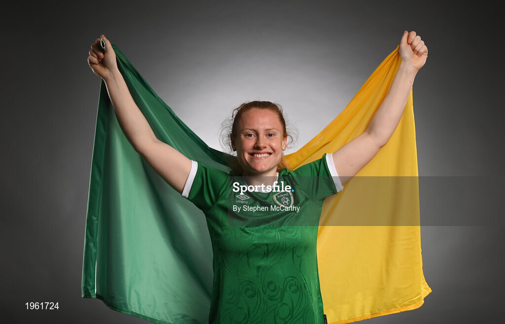 27 November 2020; Republic of Ireland's Amber Barrett, from Donegal, poses during a Republic of Ireland Women portrait session at the Castleknock Hotel in Dublin. Photo by Stephen McCarthy/Sportsfile