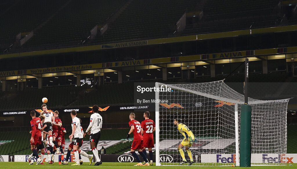 26 November 2020; Daniel Cleary of Dundalk has a header on goal during the UEFA Europa League Group B match between Dundalk and SK Rapid Wien at Aviva Stadium in Dublin. Photo by Ben McShane/Sportsfile
