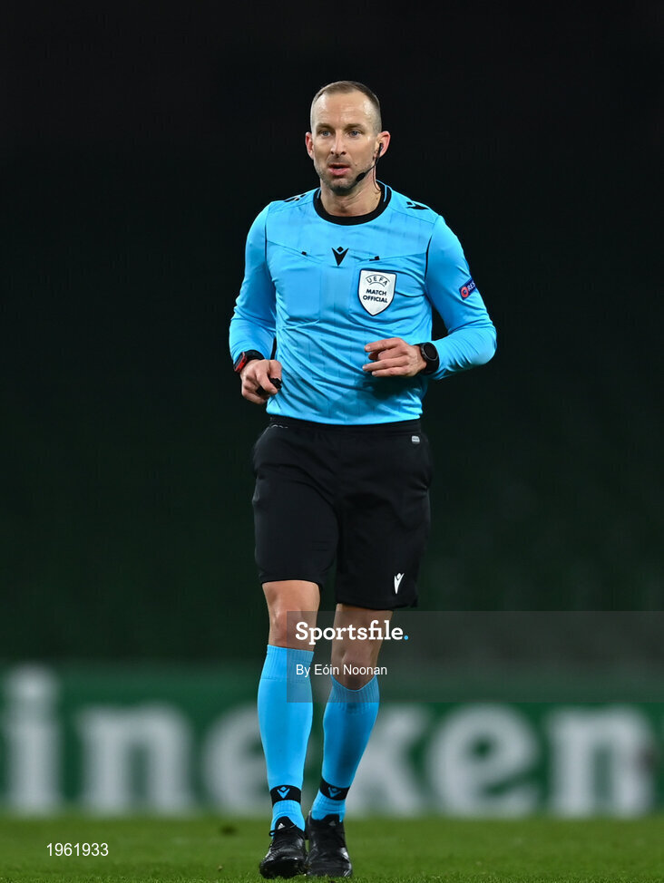 26 November 2020; Referee Tamás Bognar during the UEFA Europa League Group B match between Dundalk and SK Rapid Wien at Aviva Stadium in Dublin. Photo by Eóin Noonan/Sportsfile