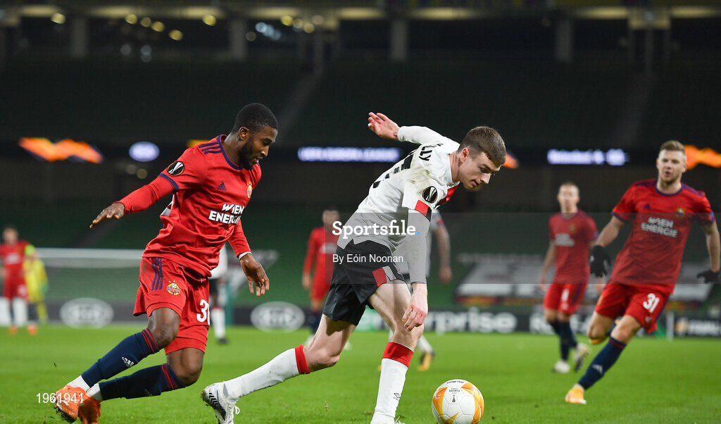 26 November 2020; Daniel Kelly of Dundalk in action against Kelvin Arase of SK Rapid Wien during the UEFA Europa League Group B match between Dundalk and SK Rapid Wien at Aviva Stadium in Dublin. Photo by Eóin Noonan/Sportsfile