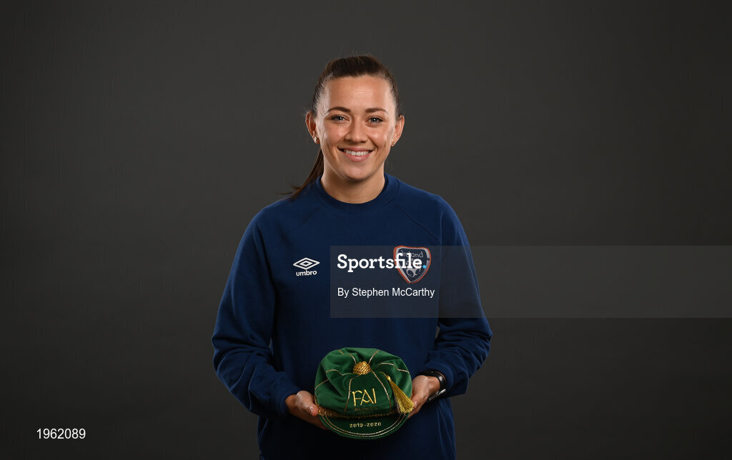 28 November 2020; Katie McCabe poses with her Republic of Ireland 2019-2020 cap during a presentation at the Castleknock Hotel in Dublin. Photo by Stephen McCarthy/Sportsfile
