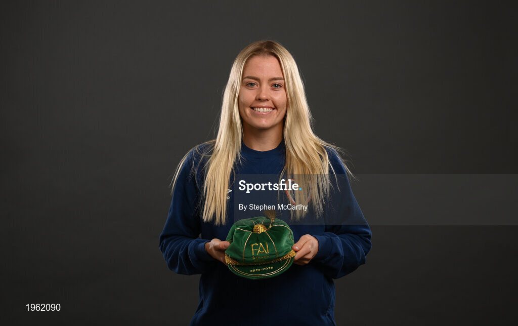 28 November 2020; Denise O'Sullivan poses with her Republic of Ireland 2019-2020 cap during a presentation at the Castleknock Hotel in Dublin. Photo by Stephen McCarthy/Sportsfile
