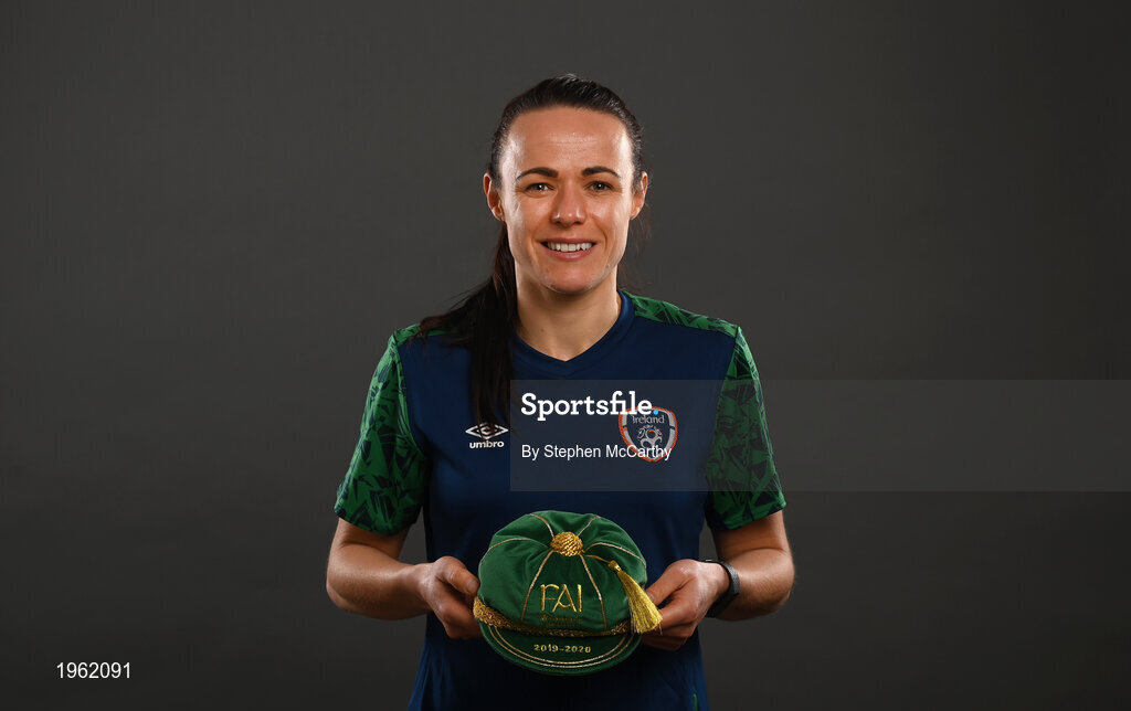 28 November 2020; Aine O'Gorman poses with her Republic of Ireland 2019-2020 cap during a presentation at the Castleknock Hotel in Dublin. Photo by Stephen McCarthy/Sportsfile