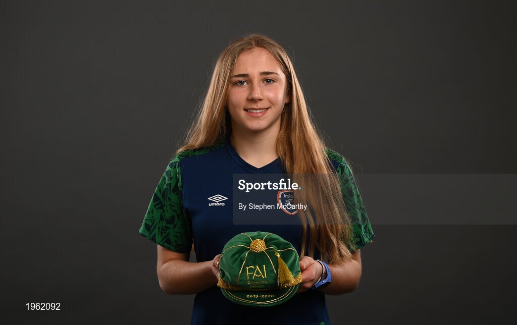 28 November 2020; Ellen Molloy poses with her Republic of Ireland 2019-2020 cap during a presentation at the Castleknock Hotel in Dublin. Photo by Stephen McCarthy/Sportsfile