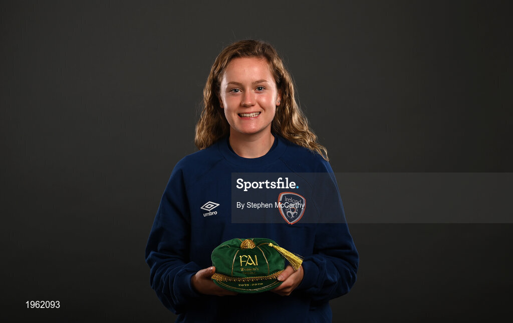 28 November 2020; Heather Payne poses with her Republic of Ireland 2019-2020 cap during a presentation at the Castleknock Hotel in Dublin. Photo by Stephen McCarthy/Sportsfile