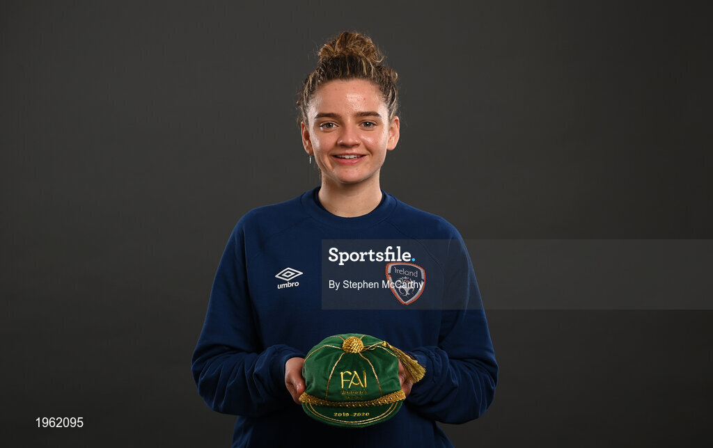 28 November 2020; Leanne Kiernan poses with her Republic of Ireland 2019-2020 cap during a presentation at the Castleknock Hotel in Dublin. Photo by Stephen McCarthy/Sportsfile