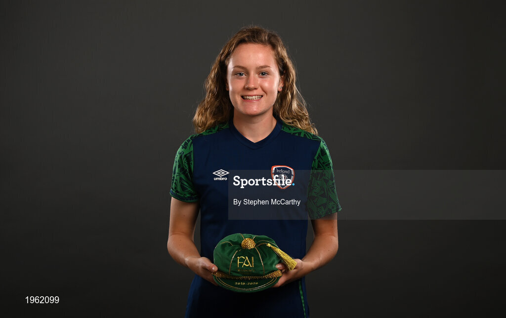 28 November 2020; Heather Payne poses with her Republic of Ireland 2019-2020 cap during a presentation at the Castleknock Hotel in Dublin. Photo by Stephen McCarthy/Sportsfile