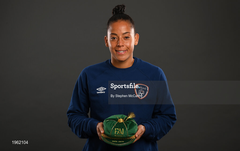 28 November 2020; Rianna Jarrett poses with her Republic of Ireland 2019-2020 cap during a presentation at the Castleknock Hotel in Dublin. Photo by Stephen McCarthy/Sportsfile