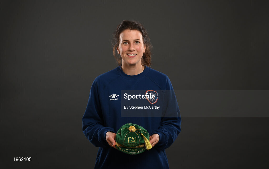 28 November 2020; Niamh Fahey poses with her Republic of Ireland 2019-2020 cap during a presentation at the Castleknock Hotel in Dublin. Photo by Stephen McCarthy/Sportsfile