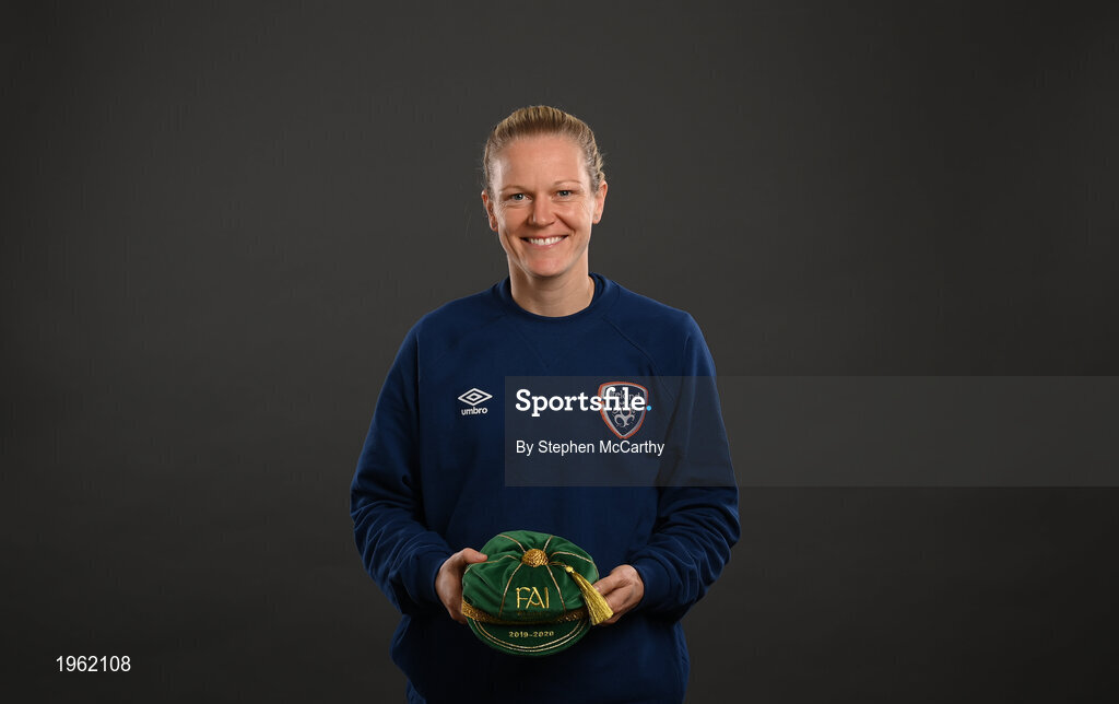 28 November 2020; Diane Caldwell poses with her Republic of Ireland 2019-2020 cap during a presentation at the Castleknock Hotel in Dublin. Photo by Stephen McCarthy/Sportsfile