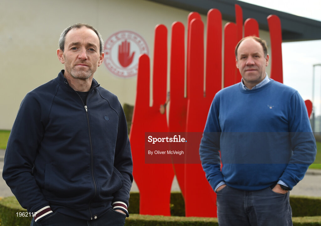 28 November 2020; Newly appointed Tyrone joint managers Brian Dooher, left, and Feargal Logan at the Tyrone GAA Centre of Excellence in Garvaghy, Tyrone. Photo by Oliver McVeigh/Sportsfile