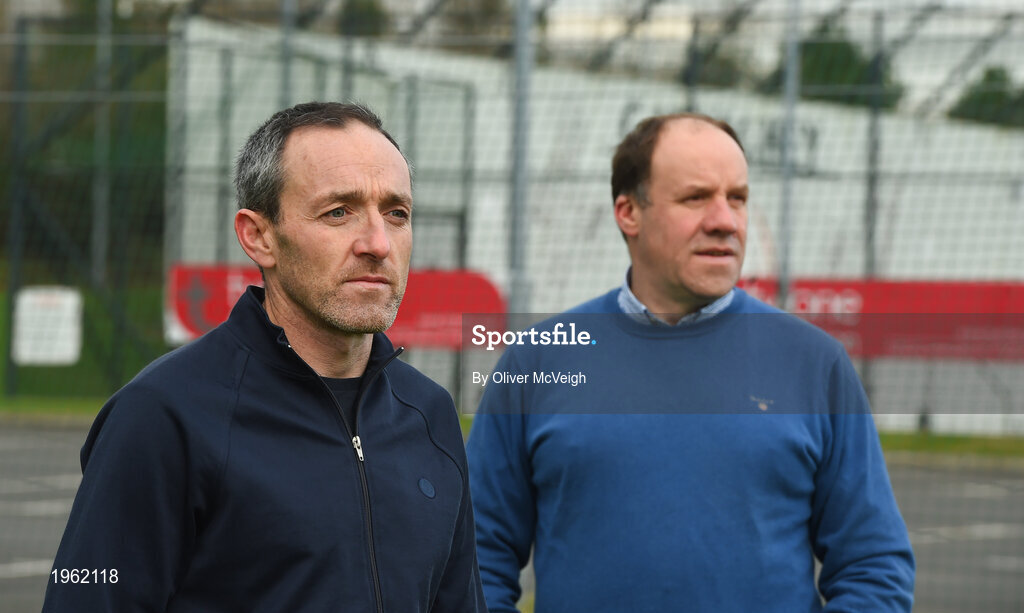 28 November 2020; Newly appointed Tyrone joint managers Brian Dooher, left, and Feargal Logan at the Tyrone GAA Centre of Excellence in Garvaghy, Tyrone. Photo by Oliver McVeigh/Sportsfile