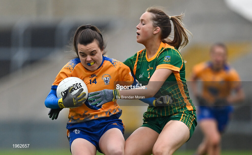 28 November 2020; Gráinne Nolan of Clare in action against Sarah Wall of Meath during the TG4 All-Ireland Intermediate Ladies Football Championship Semi-Final match between Clare and Meath at MW Hire O'Moore Park in Portlaoise, Laois. Photo by Brendan Moran/Sportsfile