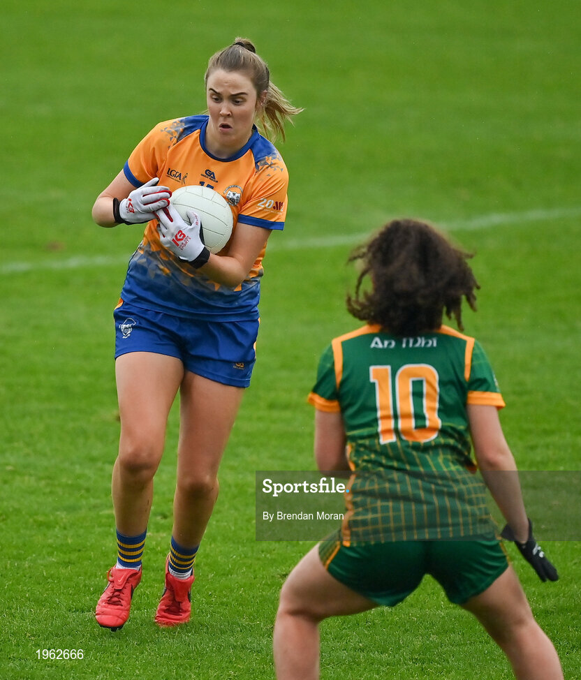 28 November 2020; Chloe Moloney of Clare in action against Emma Duggan of Meath during the TG4 All-Ireland Intermediate Ladies Football Championship Semi-Final match between Clare and Meath at MW Hire O'Moore Park in Portlaoise, Laois. Photo by Brendan Moran/Sportsfile