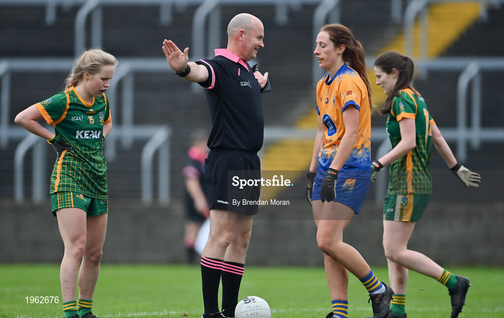 28 November 2020; Referee Shane Curley signals a penalty for Meath during the TG4 All-Ireland Intermediate Ladies Football Championship Semi-Final match between Clare and Meath at MW Hire O'Moore Park in Portlaoise, Laois. Photo by Brendan Moran/Sportsfile