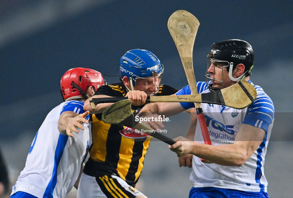 28 November 2020; John Donnelly of Kilkenny in action against Tadhg de Búrca/left Kevin Moran of Waterford during the GAA Hurling All-Ireland Senior Championship Semi-Final match between Kilkenny and Waterford at Croke Park in Dublin. Photo by Ramsey Cardy/Sportsfile