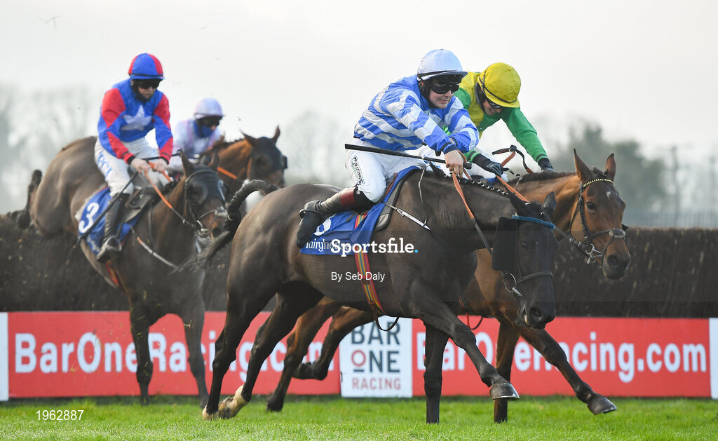 29 November 2020; Cushinstown Finest, left, with Jordan Gainford up, leads eventual winner Mega Mindy, right, with Bryan Cooper up, on their way to finishing second in the Bar One Racing Best Odds Guaranteed Irish EBF Mares Handicap Steeplechase on day two of the Fairyhouse Winter Festival at Fairyhouse Racecourse in Ratoath, Meath. Photo by Seb Daly/Sportsfile