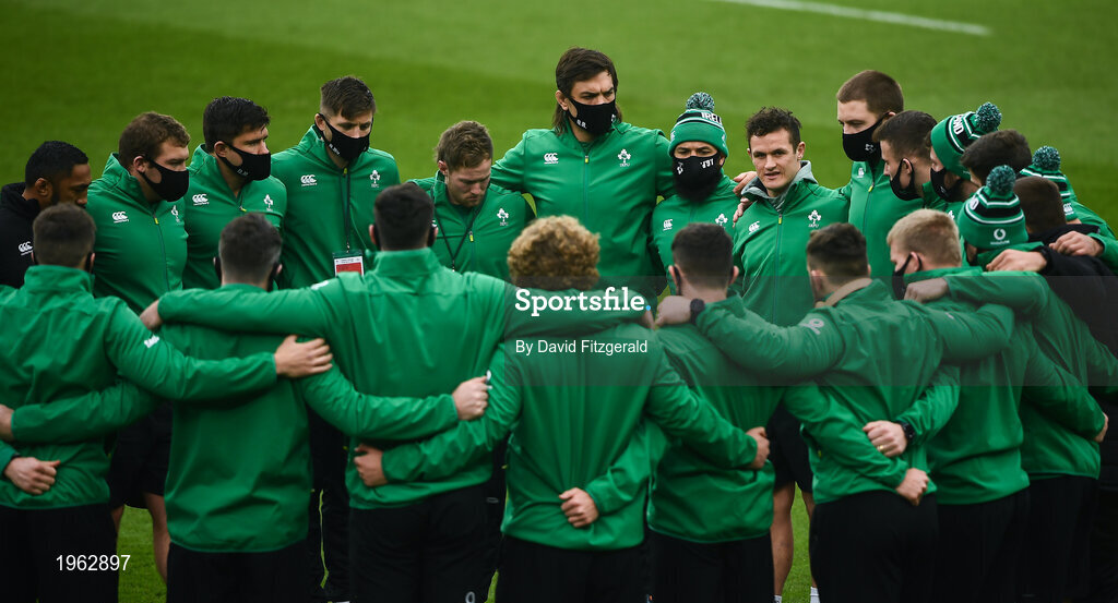 29 November 2020; Billy Burns of Ireland speaks to his team-mates prior to the Autumn Nations Cup match between Ireland and Georgia at the Aviva Stadium in Dublin. Photo by David Fitzgerald/Sportsfile