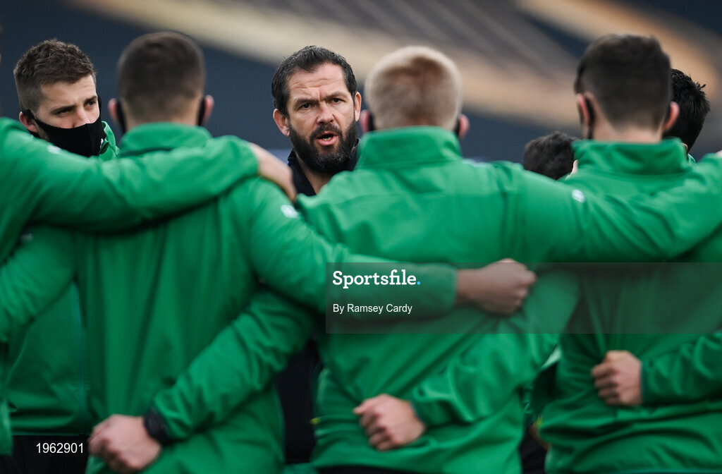 29 November 2020; Ireland head coach Andy Farrell speaks to his players ahead of the Autumn Nations Cup match between Ireland and Georgia at the Aviva Stadium in Dublin. Photo by Ramsey Cardy/Sportsfile