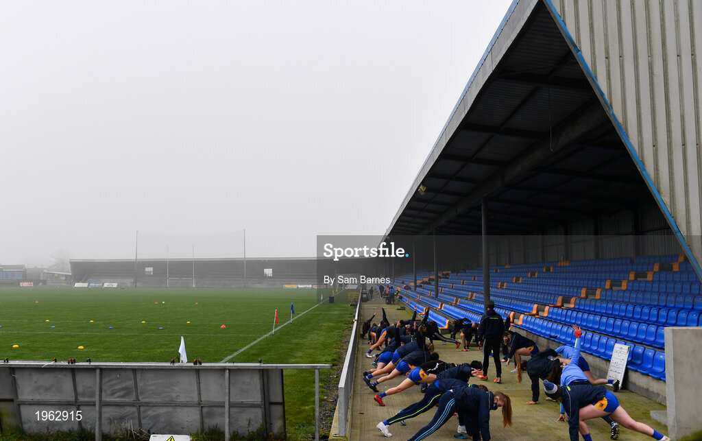 29 November 2020; Roscommon players warm up beside the pitch ahead of the TG4 All-Ireland Intermediate Ladies Football Championship Semi-Final match between Roscommon and Westmeath at Glennon Brothers Pearse Park in Longford. Photo by Sam Barnes/Sportsfile