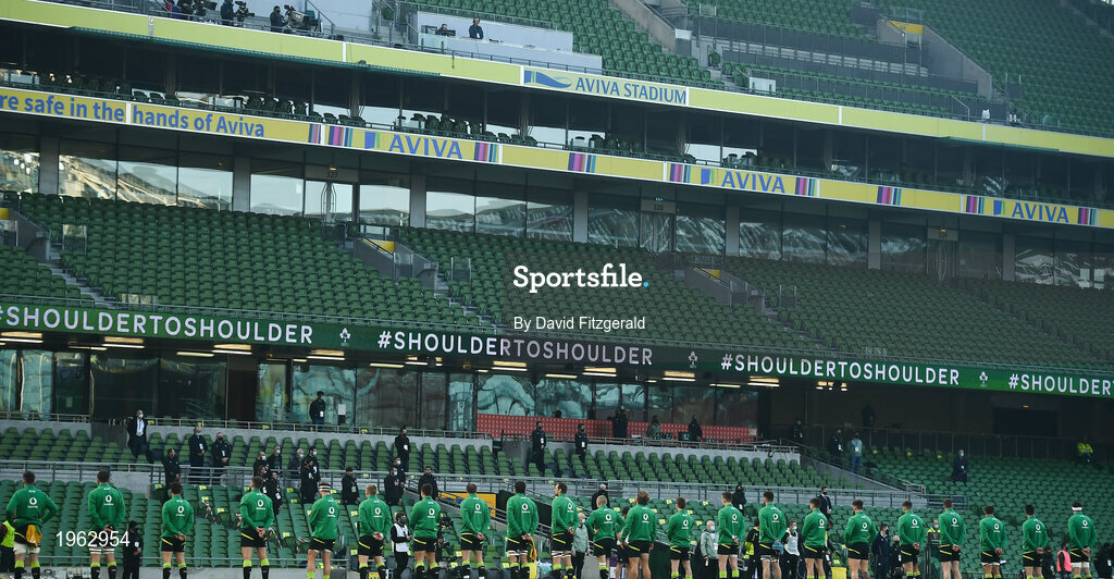29 November 2020; Ireland players stand for the national anthem prior to the Autumn Nations Cup match between Ireland and Georgia at the Aviva Stadium in Dublin. Photo by David Fitzgerald/Sportsfile
