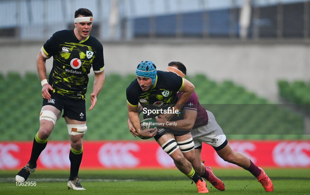 29 November 2020; Will Connors of Ireland is tackled by Merab Sharikadze of Georgia during the Autumn Nations Cup match between Ireland and Georgia at the Aviva Stadium in Dublin. Photo by Ramsey Cardy/Sportsfile
