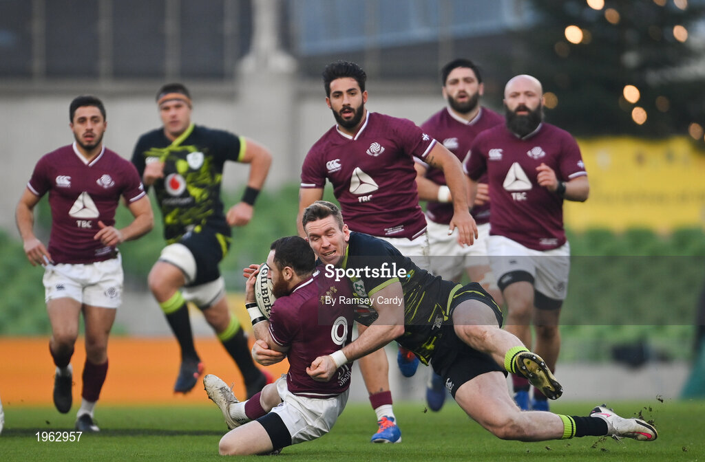29 November 2020; Vasil Lobzhanidze of Georgia is tackled by Chris Farrell of Ireland during the Autumn Nations Cup match between Ireland and Georgia at the Aviva Stadium in Dublin. Photo by Ramsey Cardy/Sportsfile