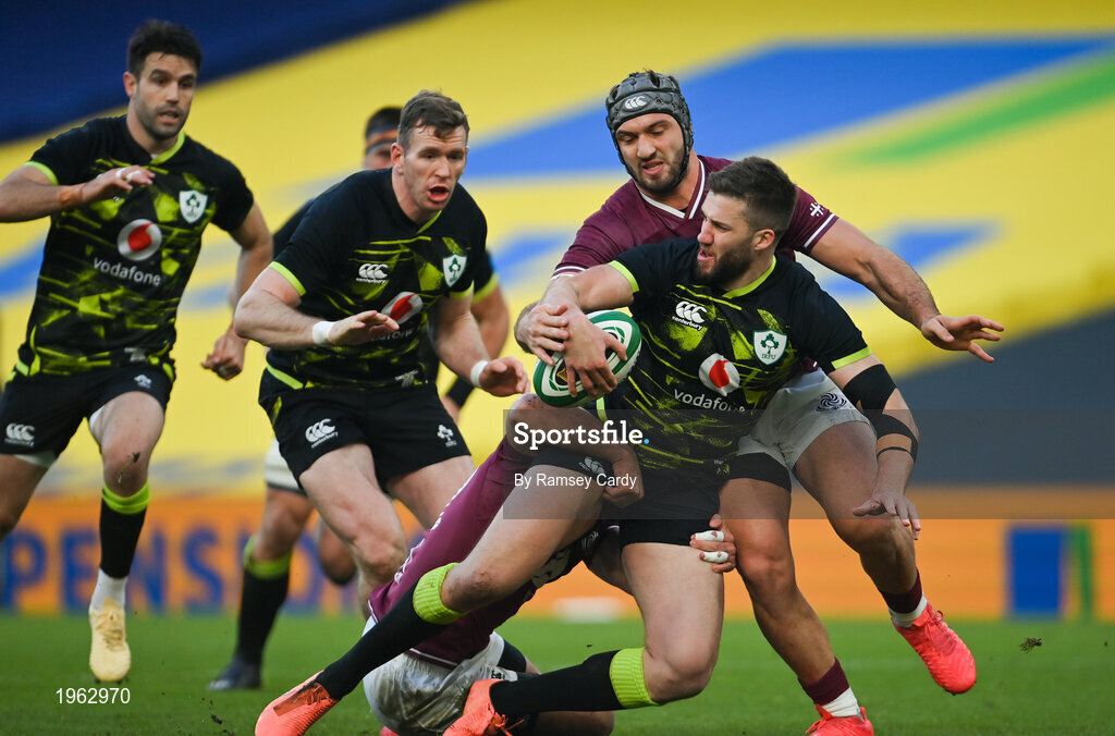 29 November 2020; Stuart McCloskey of Ireland is tackled by Merab Sharikadze, left, and Beka Gorgadze of Georgia during the Autumn Nations Cup match between Ireland and Georgia at the Aviva Stadium in Dublin. Photo by Ramsey Cardy/Sportsfile