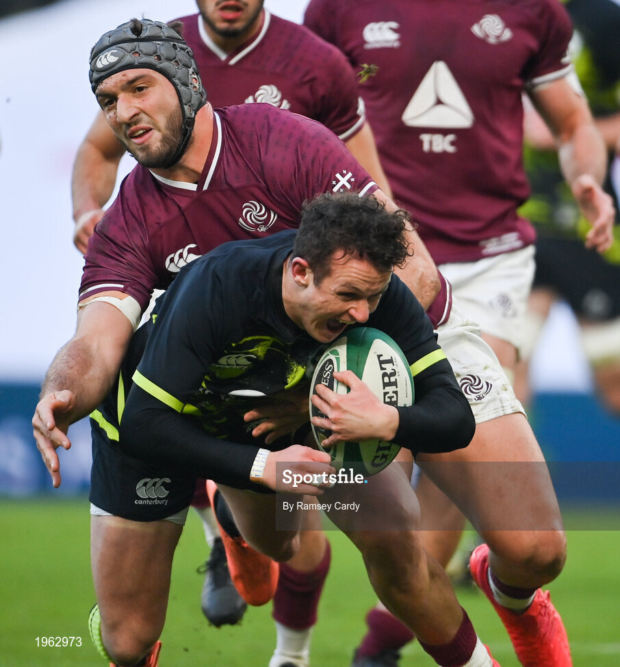 29 November 2020; Billy Burns of Ireland dives over to score his side's first try despite the tackle of Beka Gorgadze of Georgia during the Autumn Nations Cup match between Ireland and Georgia at the Aviva Stadium in Dublin. Photo by Ramsey Cardy/Sportsfile