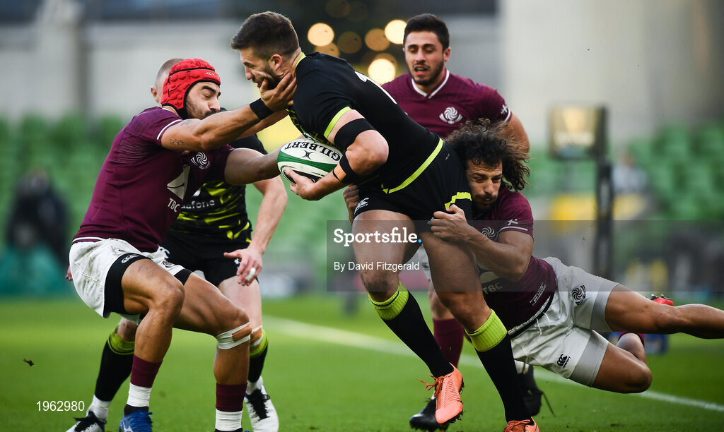 29 November 2020; Stuart McCloskey of Ireland is tackled by Akaki Tabutsadze, left, and Soso Matiashvili of Georgia during the Autumn Nations Cup match between Ireland and Georgia at the Aviva Stadium in Dublin. Photo by David Fitzgerald/Sportsfile