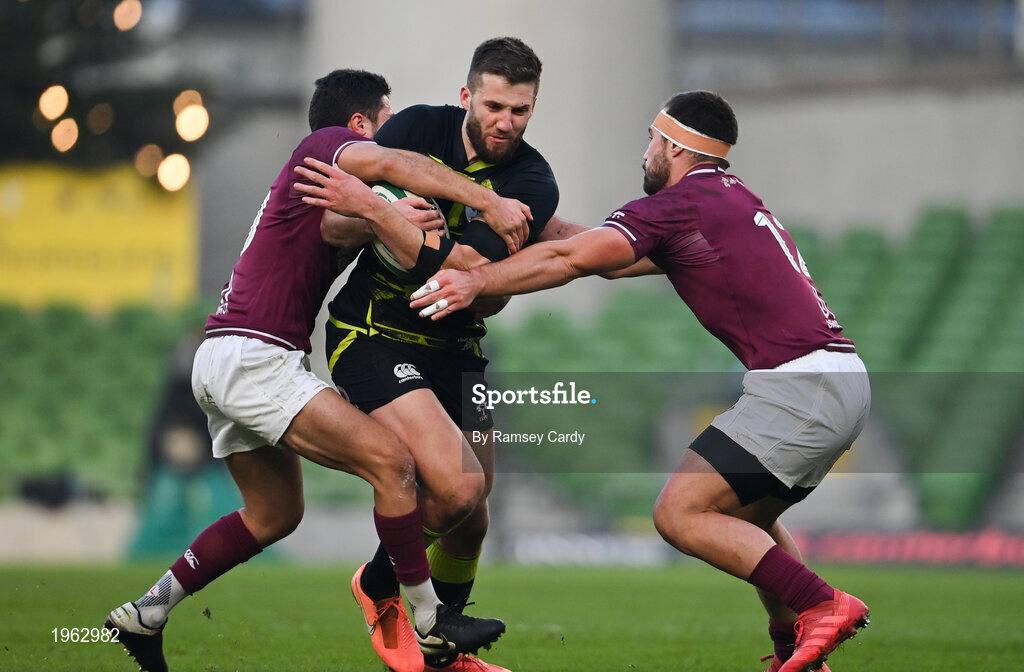29 November 2020; Stuart McCloskey of Ireland is tackled by Tedo Abzhandadze, left, and Merab Sharikadze of Georgia during the Autumn Nations Cup match between Ireland and Georgia at the Aviva Stadium in Dublin. Photo by Ramsey Cardy/Sportsfile