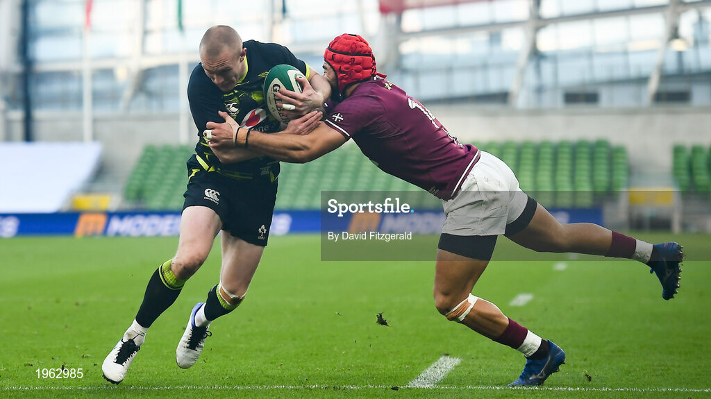 29 November 2020; Keith Earls of Ireland is tackled by Akaki Tabutsadze of Georgia during the Autumn Nations Cup match between Ireland and Georgia at the Aviva Stadium in Dublin. Photo by David Fitzgerald/Sportsfile