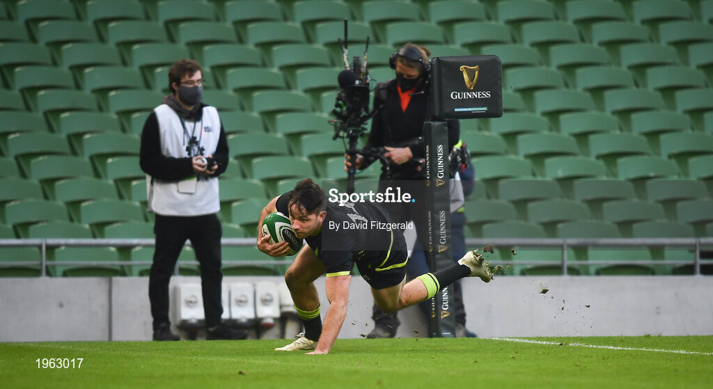 29 November 2020; Hugo Keenan of Ireland scores his side's second try during the Autumn Nations Cup match between Ireland and Georgia at the Aviva Stadium in Dublin. Photo by David Fitzgerald/Sportsfile