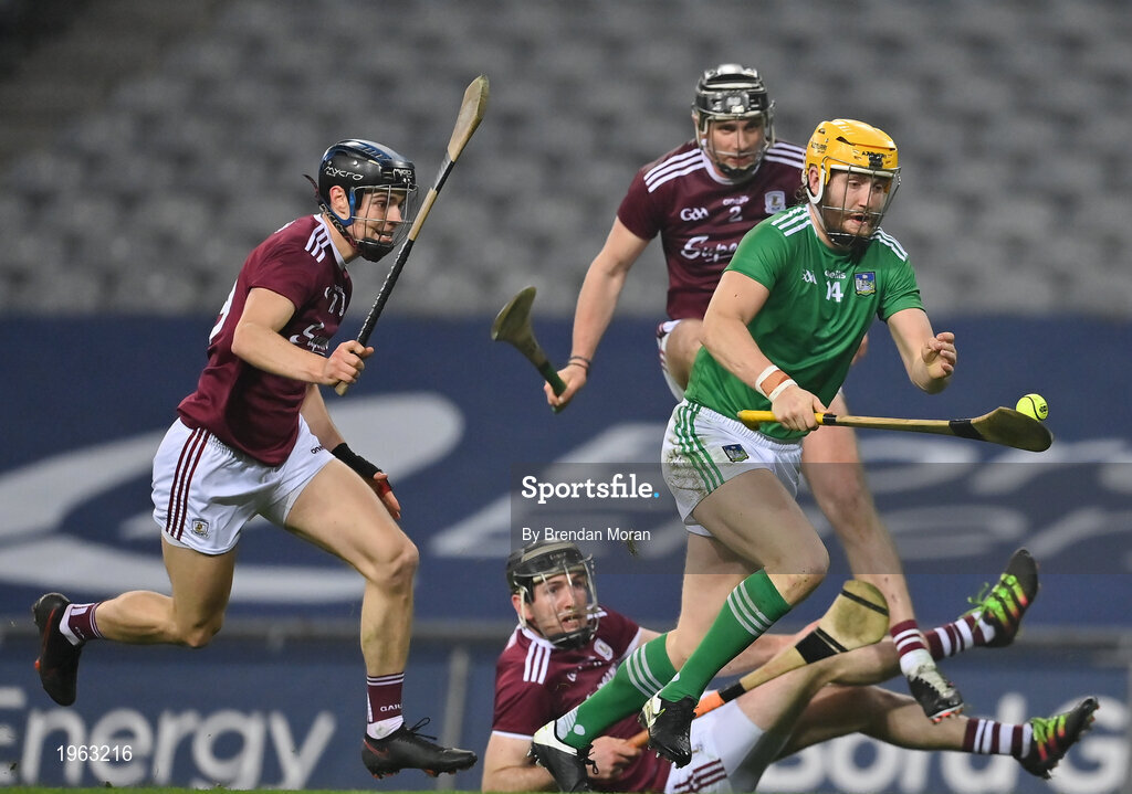 29 November 2020; Seamus Flanagan of Limerick in action against Galway players, Seán Loftus, Padraic Mannion and Aidan Harte during the GAA Hurling All-Ireland Senior Championship Semi-Final match between Limerick and Galway at Croke Park in Dublin. Photo by Brendan Moran/Sportsfile