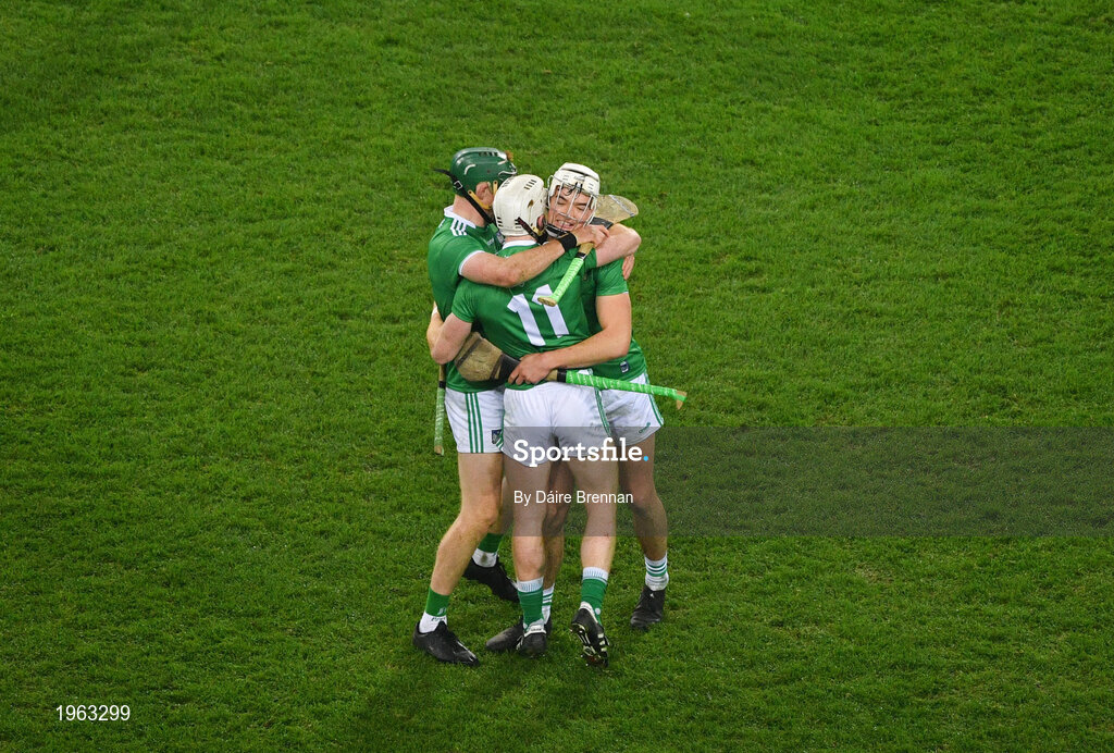 29 November 2020; William O’Donoghue, left, Cian Lynch, and Kyle Hayes of Limerick celebrate after the GAA Hurling All-Ireland Senior Championship Semi-Final match between Limerick and Galway at Croke Park in Dublin. Photo by Daire Brennan/Sportsfile