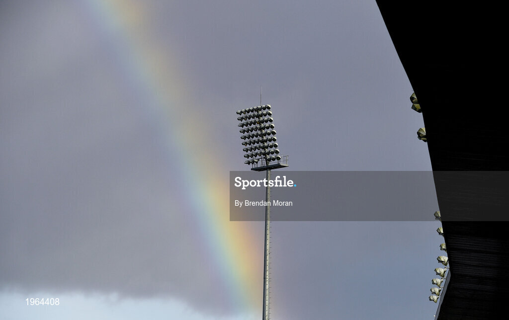15 November 2020; A rainbow is seen near the floodlights during the Munster GAA Hurling Senior Championship Final match between Limerick and Waterford at Semple Stadium in Thurles, Tipperary. Photo by Brendan Moran/Sportsfile
