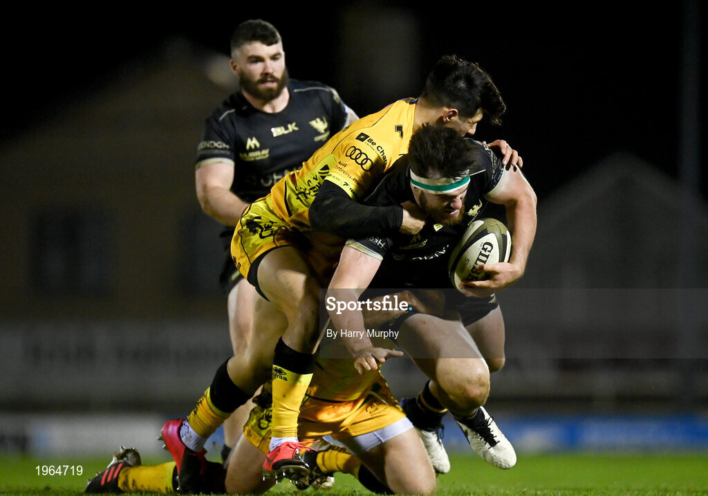 4 December 2020; Tom Daly of Connacht is tackled by Tommaso Menoncello and Ian Keatley of Benetton during the Guinness PRO14 match between Connacht and Benetton at the Sportsground in Galway. Photo by Harry Murphy/Sportsfile