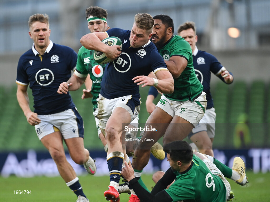5 December 2020; Duhan van der Merwe of Scotland is tackled by Conor Murray and Bundee Aki of Ireland during the Autumn Nations Cup match between Ireland and Scotland at the Aviva Stadium in Dublin. Photo by Ramsey Cardy/Sportsfile