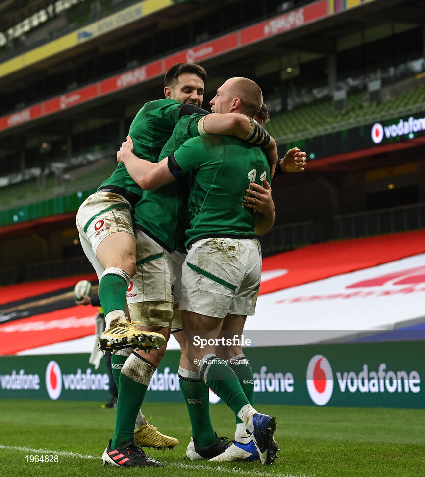 5 December 2020; Keith Earls of Ireland celebrates after scoring his side's third try with team-mates including Conor Murray during the Autumn Nations Cup match between Ireland and Scotland at the Aviva Stadium in Dublin. Photo by Ramsey Cardy/Sportsfile