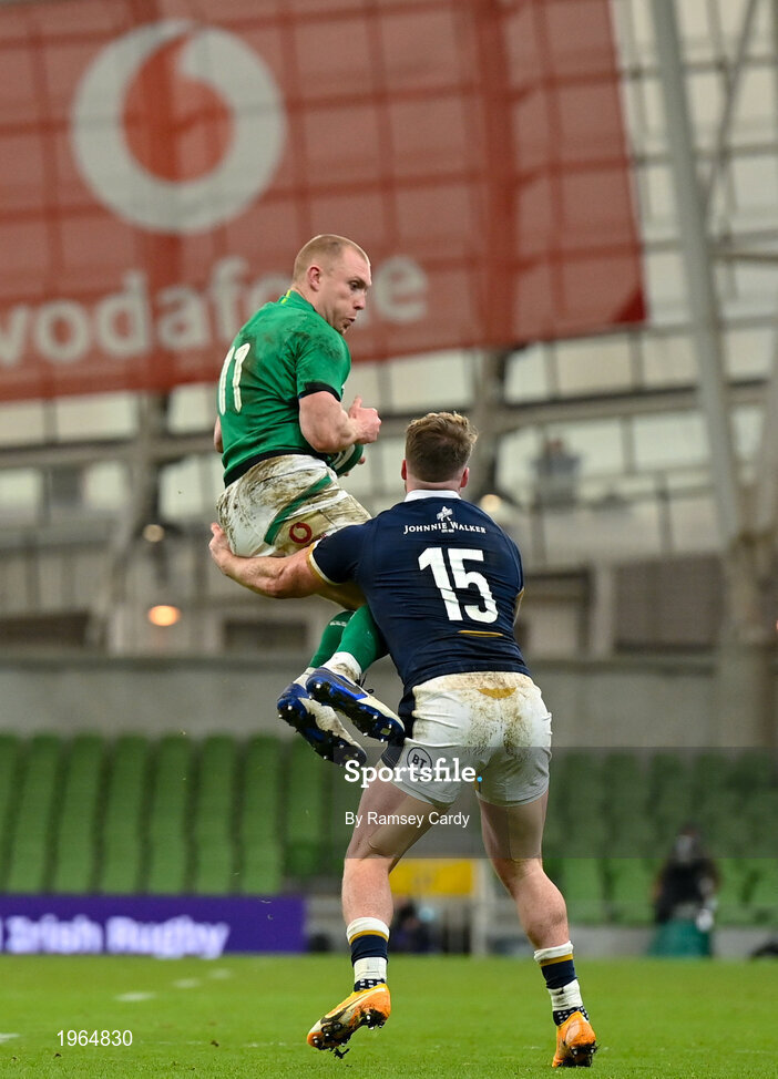 5 December 2020; Keith Earls of Ireland in action against Stuart Hogg of Scotland during the Autumn Nations Cup match between Ireland and Scotland at the Aviva Stadium in Dublin. Photo by Ramsey Cardy/Sportsfile