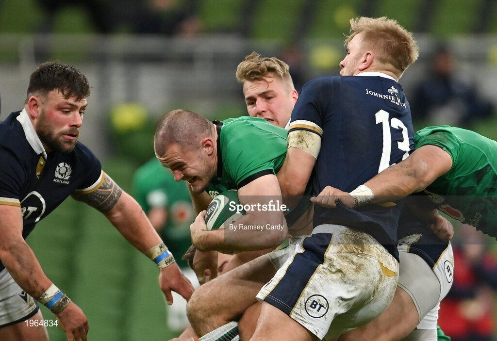 5 December 2020; Jacob Stockdale of Ireland is tackled by Chris Harris of Scotland during the Autumn Nations Cup match between Ireland and Scotland at the Aviva Stadium in Dublin. Photo by Ramsey Cardy/Sportsfile