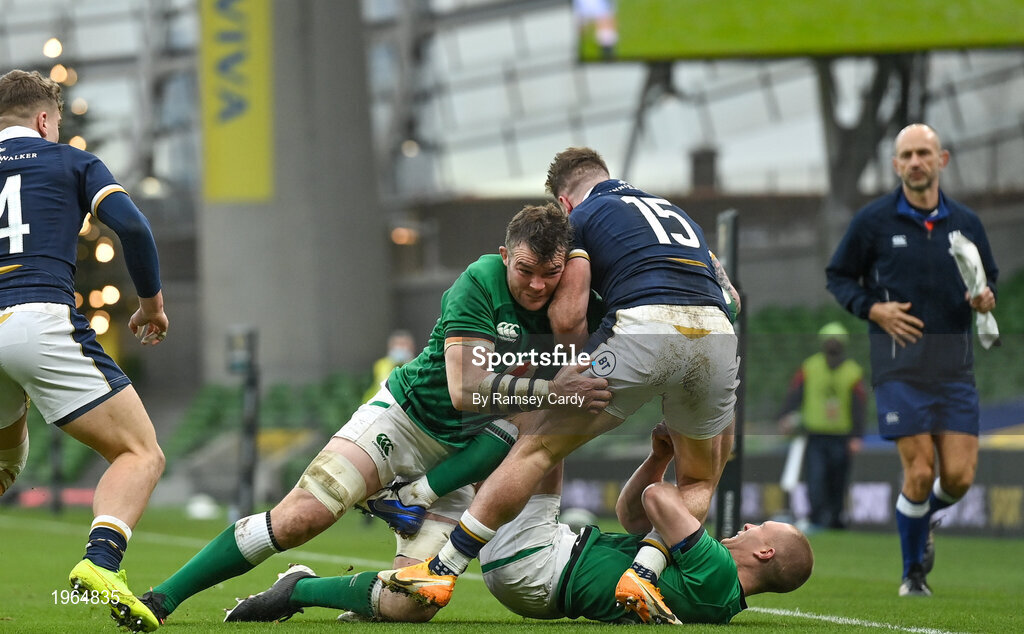 5 December 2020; Stuart Hogg of Scotland is tackled by Peter O'Mahony and Keith Earls of Ireland during the Autumn Nations Cup match between Ireland and Scotland at the Aviva Stadium in Dublin. Photo by Ramsey Cardy/Sportsfile