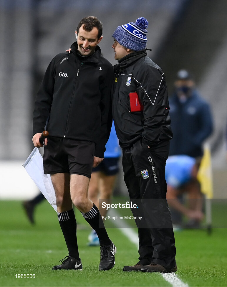5 December 2020; Cavan manager Mickey Graham speaks with linesman Paul Faloon during the GAA Football All-Ireland Senior Championship Semi-Final match between Cavan and Dublin at Croke Park in Dublin. Photo by Stephen McCarthy/Sportsfile