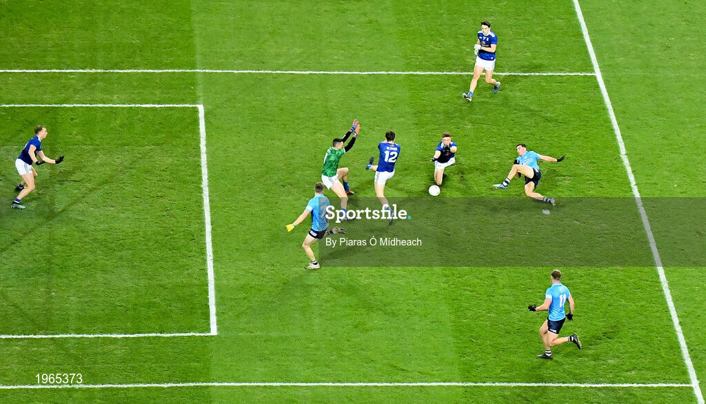 5 December 2020; Niall Scully of Dublin takes a shot on goal which was blocked by Oisín Kiernan of Cavan and Cavan goalkeeper Raymond Galligan during the GAA Football All-Ireland Senior Championship Semi-Final match between Cavan and Dublin at Croke Park in Dublin. Photo by Piaras Ó Mídheach/Sportsfile
