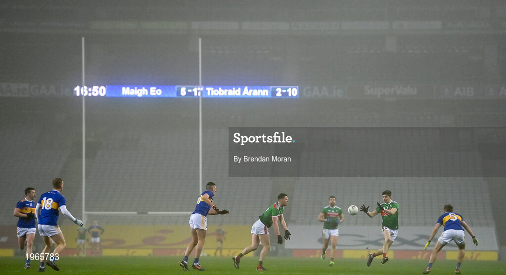 6 December 2020; Matthew Ruane of Mayo passes the ball to team-mate Conor Loftus during the GAA Football All-Ireland Senior Championship Semi-Final match between Mayo and Tipperary at Croke Park in Dublin. Photo by Brendan Moran/Sportsfile