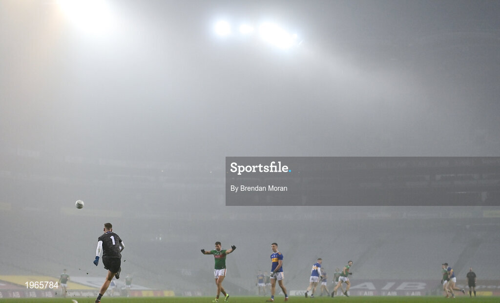 6 December 2020; Tipperary goalkeeper Evan Comerford kicks the ball out amid heavy fog during the GAA Football All-Ireland Senior Championship Semi-Final match between Mayo and Tipperary at Croke Park in Dublin. Photo by Brendan Moran/Sportsfile