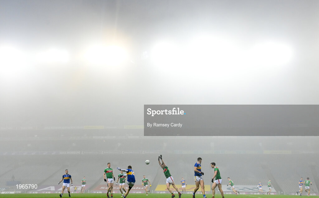 6 December 2020; Colman Kennedy of Tipperary kicks at goal under pressure from Stephen Coen of Mayo during the GAA Football All-Ireland Senior Championship Semi-Final match between Mayo and Tipperary at Croke Park in Dublin. Photo by Ramsey Cardy/Sportsfile