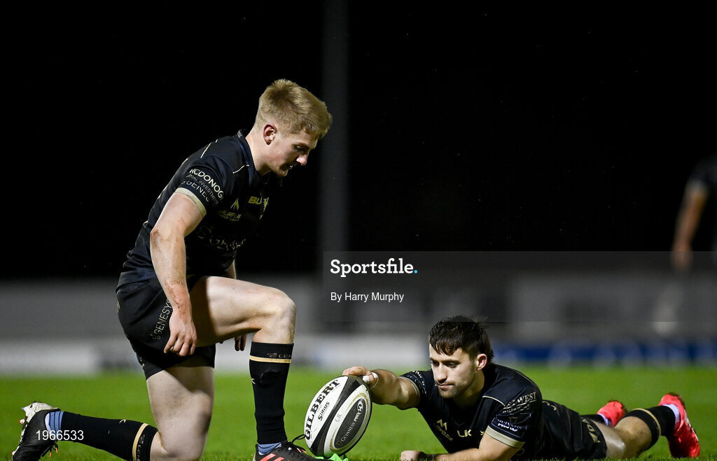 4 December 2020; Conor Fitzgerald, left, and Caolin Blade of Connacht during the Guinness PRO14 match between Connacht and Benetton at the Sportsground in Galway. Photo by Harry Murphy/Sportsfile