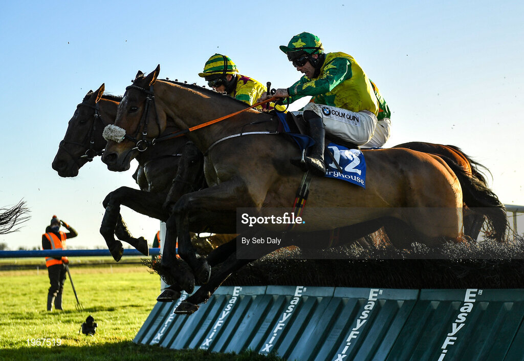 12 December 2020; Mattie's Mountain, with Kevin Brouder up, jumps the last on their way to winning the Irish Racing Industry Fundraiser For Children's Health Foundation Crumlin In Memory Of Pat Smullen Handicap Hurdle at Fairyhouse Racecourse in Ratoath, Meath. Photo by Seb Daly/Sportsfile